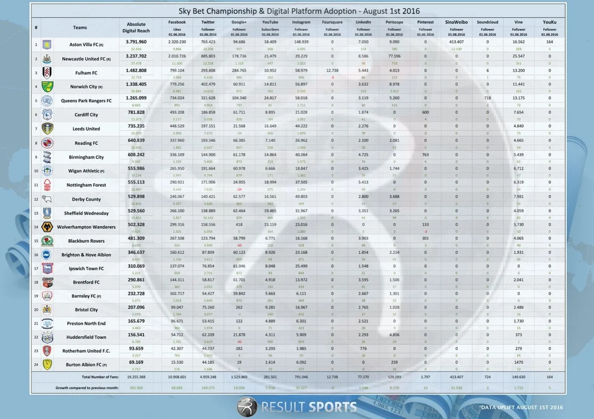 The 2016/17 Championship season started at the weekend. The big leagues get all the attention so I thought the English second-tier needed a little love. Here’s my analysis of the excellent social media stats from Result Sports